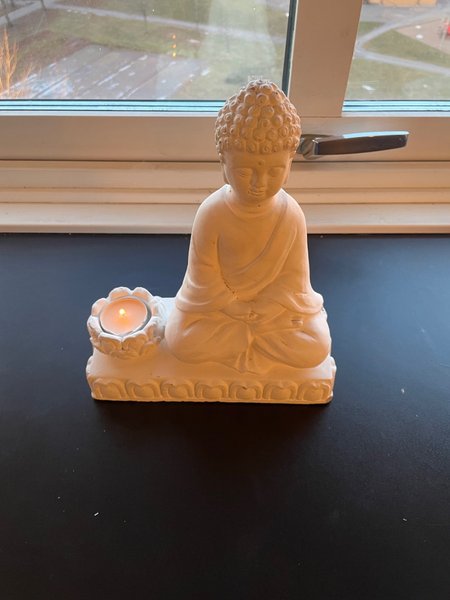 En dekorativ Buddha-staty med en integrerad ljusstake. Perfekt för att skapa en lugn och harmonisk atmosfär i hemmet.