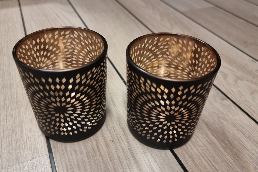 Två ljuslyktor i svart och guld., mycket stilfulla i hemmet, sprider ett fantastiskt sken och skapar en mysig atmosfär I hemmet.