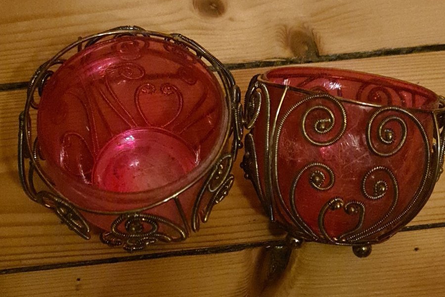 Två ljuslyktor i ceriserosa glas med metallställning i guldig nyans. 8 cm i diameter, 7 cm höga.