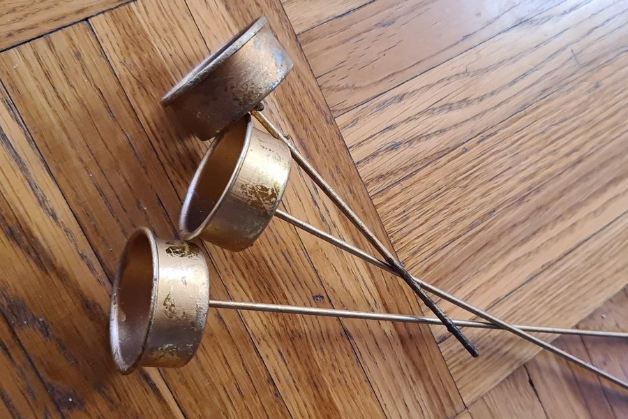 Tre mässingsfärgade ljushållare att sticka ner i jord eller annat mjukt material. Lämpliga till värmeljus. 2 st 25 cm och 1 st 15 cm.