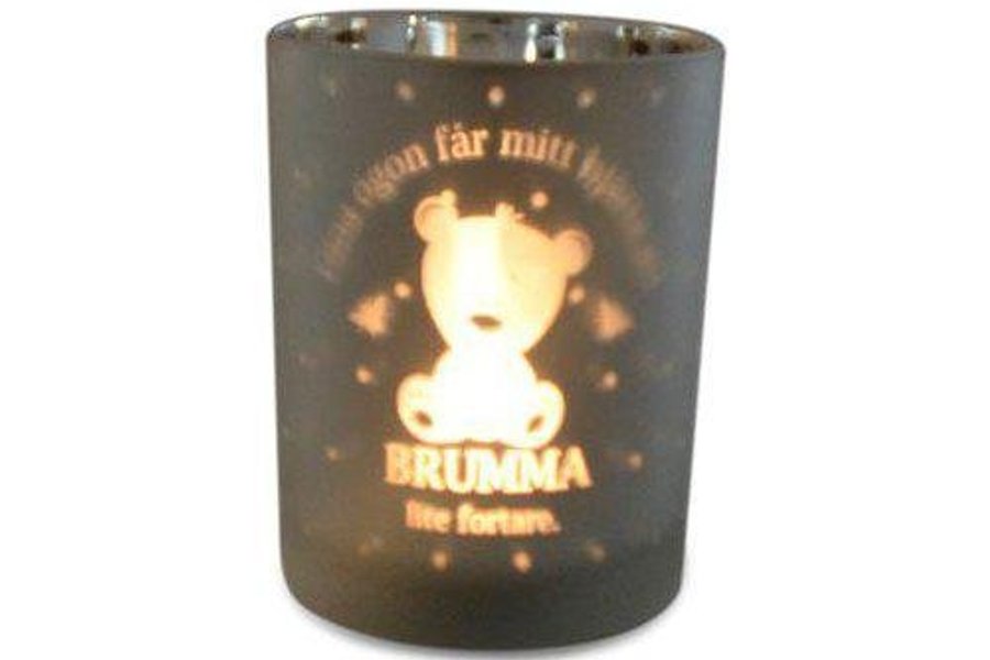 Ljuslykta i silverfärgat glas och silverfärgad insida. Lyser jättemysigt igenom texten på framsidan när du tänder ett ljus.