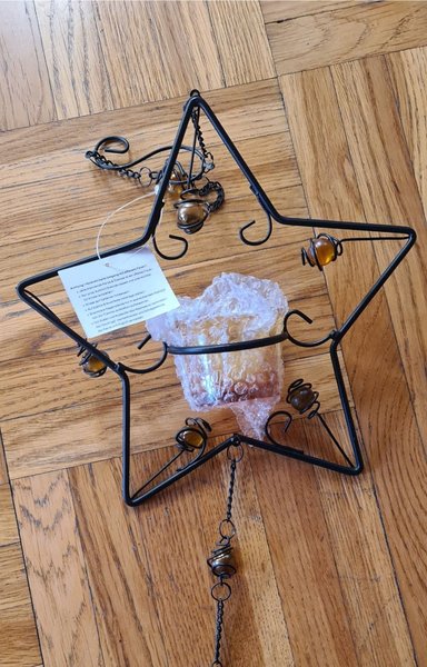 Ljushållare i form av en stjärna i metall och glas. Glaset är bärnstensfärgat. Mått ca 20x20 cm.