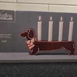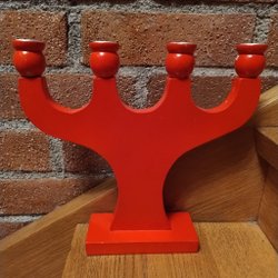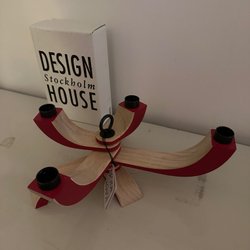 Ny Vit adventsljusstake med plats för fyra ljus. Dekorativa röda symboler på varje ljushållare.