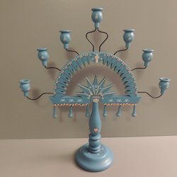 Ljusstake för tre ljus i trä. Beige och blå