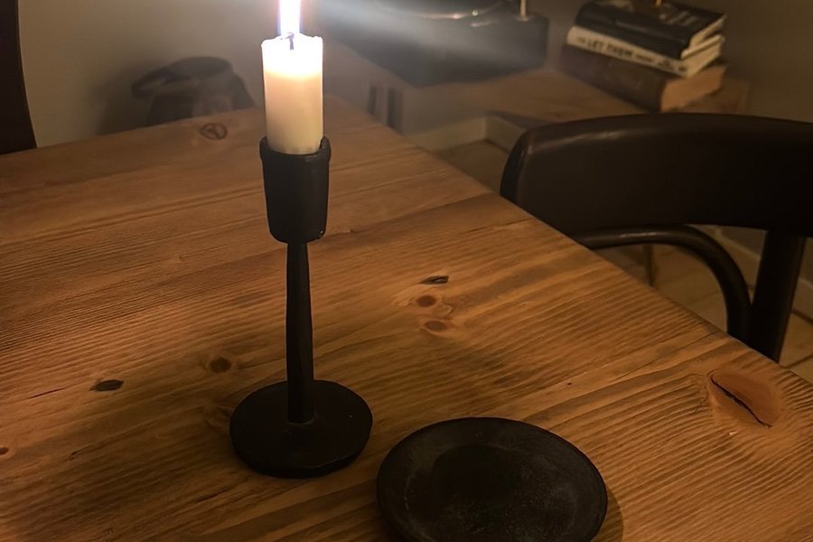 En smidesljusstake för levande ljus. Passar fint som dekoration i hemmet. Även med liten assiett