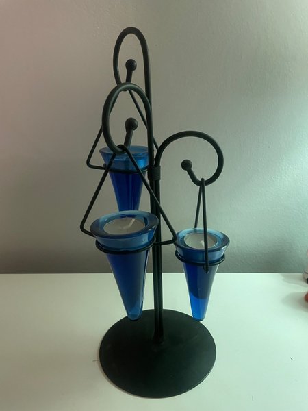 En dekorativ ljusstake i svart smide med tre blå ljushållare i glas. Perfekt för att skapa en mysig stämning.