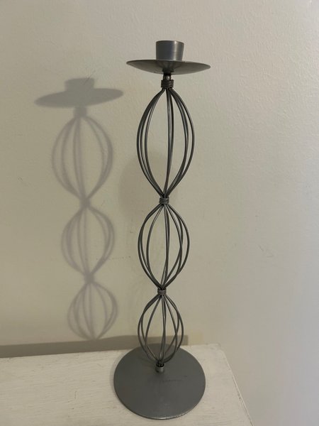 En dekorativ ljusstake i metall. Den har en unik design med tre sektioner formade som ovaler. Ljuskoppen 20mm. Ljusstaken 35 cm hög.