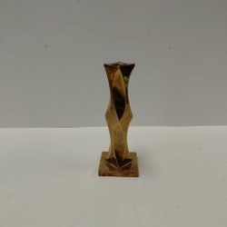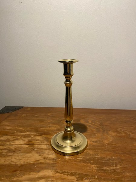 En ljusstake i mässing. Ljusstaken har en rund bas och en smal, avsmalnande stam som vidgas upptill för att hålla ett ljus.