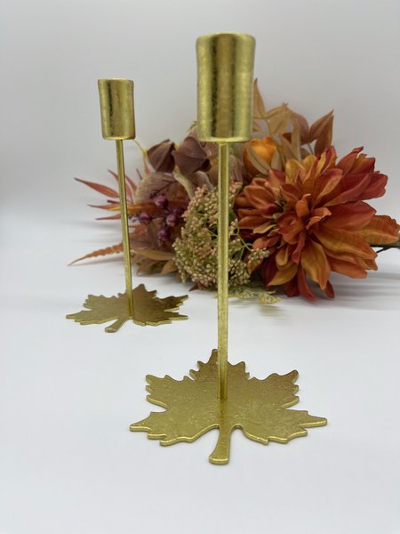 Två stycken ljusstakar i bladform. De är i guld färg och har en fin detaljrik design. Perfekt för att skapa en mysig stämning i hemmet.