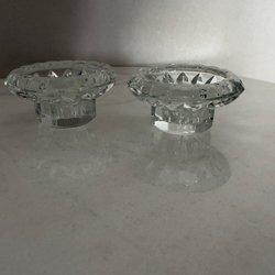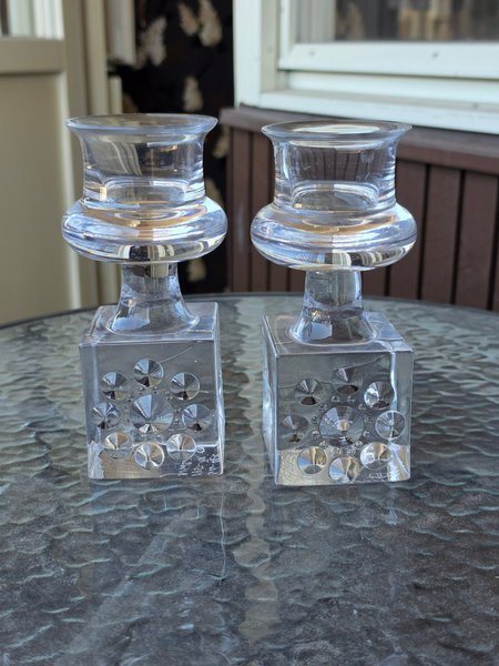 Ett par ljusstakar i glas. Fyrkantig bas med runda detaljer.