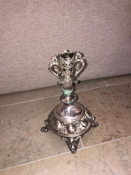 Ljusstake i silverfärg med detaljerade utsmyckningar. Foten är rund med fyra fötter och har dekorativa mönster och runda upphöjningar. Staken har en snirklig design med bladliknande detaljer.