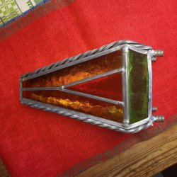Ljuslykta i turkos glas. Reflekterande turkos utsida och silver insida, färgen genombruten med dekorativt mönster. Fint skick, se bilder.