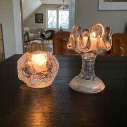Två ljuslyktor (en brun och en grön) i glas med dekorativa band och ugglor. Höjd och bredd ca 8cm.