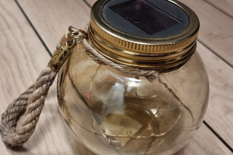 Maritim ljuslykta, glasburk med hampasnöre. Perfekt som stämningsbelysning.solcellslampan fungerar ej, men kan vara en ledning som är lös initi för den händige. Medföljer en ljusslinga istället. En dekorativ inredningsdetalj I hemmet, ute och inne.
