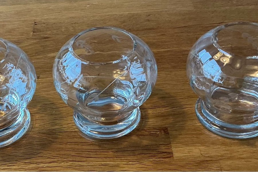 Lovisa ljuslyktor i klarglas. Varje lykta har ett etsat mönster av blad och rankor. De har en rundad form med en stabil fot. Passar för värmeljus eller som små vaser.