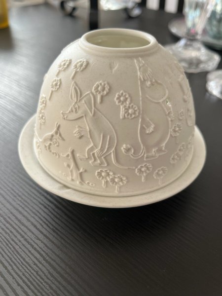 Ljuslykta med Muminmotiv. Lyktan är vit med detaljerade figurer och blommor i relief. El ljus medföljer