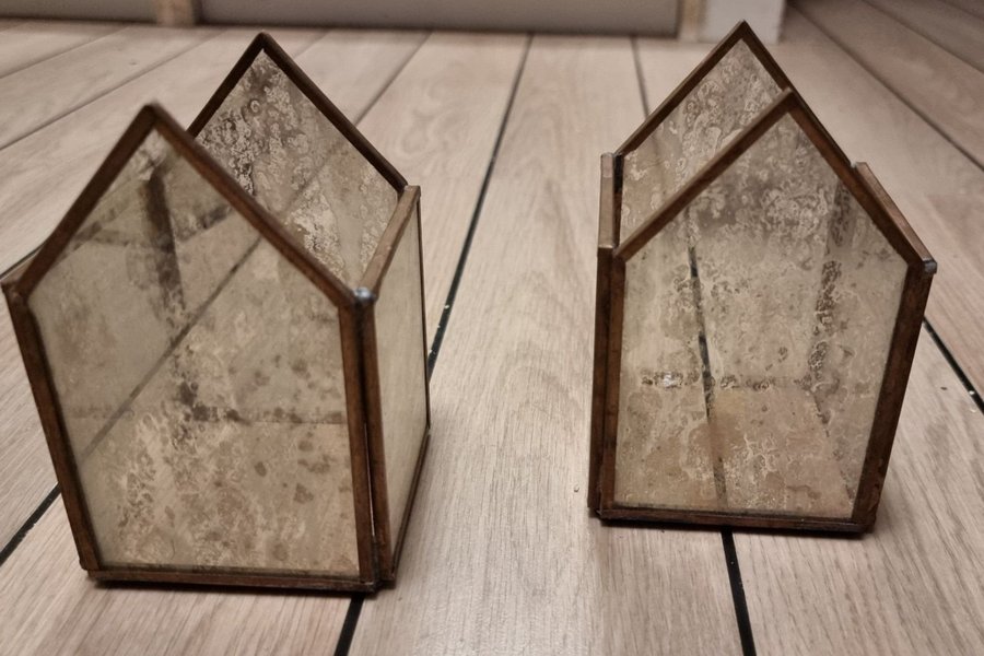 Två ljuslyktor i glas.Mycket eleganta och stilfulla ljuslyktor hus i plåt och glas. Har 2 lika dana till om man skulle önska flera, hör gärna av er om det är önskvärt innan ni budar/ köper så kan jag lägga upp till rabattpris och samfraktpris .Glasen har guldfärg i sej, vilket bildar ett varmt lunt sken I hemmet, när mörkret faller på.