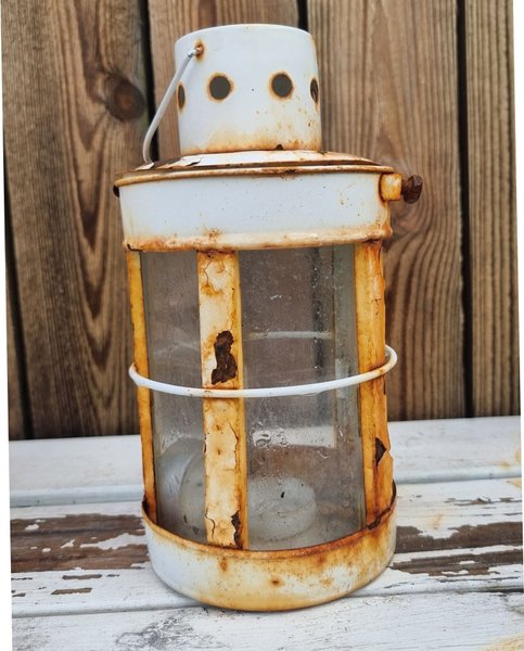 En charmig lykta som sprider ett varmt sken. Perfekt för att skapa en mysig atmosfär. Har stått ute och därmed fått en naturlig rost på sej. Har ej använt den själv. Kommer att tvättas och putsas vid auktionens avslut.