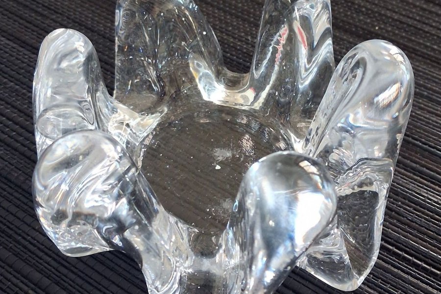 Ljuslykta i klarglas. Lyktan har en organisk form med sex "armar" som sträcker sig uppåt, vilket skapar en intressant silhuett. Den är designad för att hålla ett värmeljus eller en mindre ljuskälla i mitten. Ljuslyktan är tillverkad av tjockt glas.