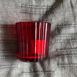 En röd ljuslykta för värmeljus. Höjden är cirka 8 cm och diametern är cirka 9 cm.