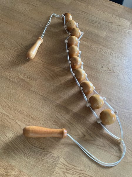 Massagerulle med handtag i trä och rullande kulor för rygg och kropp.