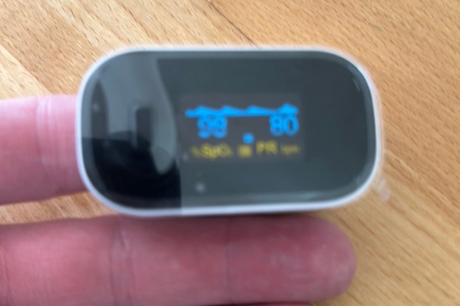 Pulsoximeter för mätning av syremättnad (SpO2) och pulsfrekvens (PRbpm). Enheten visar mätvärdena tydligt på en digital display.