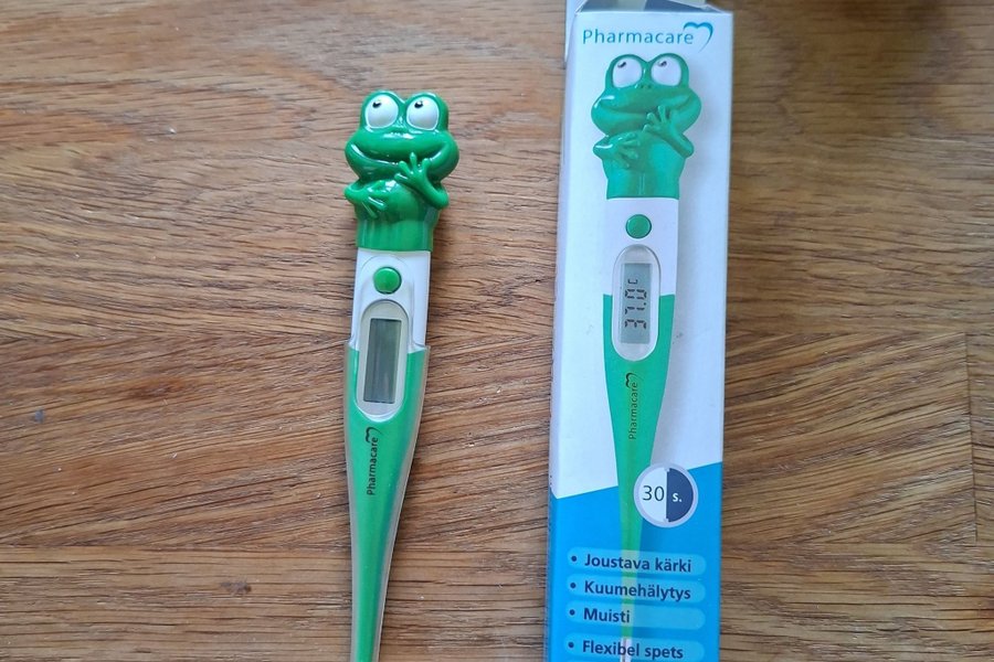 Pharmacare termometer med en söt groda som design. Den har en flexibel spets, feberlarm och minnesfunktion. Mäter temperaturen på 30 sekunder.