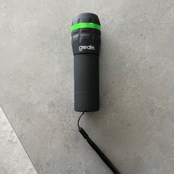 Ficklampalampa med handtag. Se måttbandet på bilderna för storlek. Lampan lyser som ni ser på sista bilderna men batterier medföljer ej. Glaset har en spricka tvärs över.