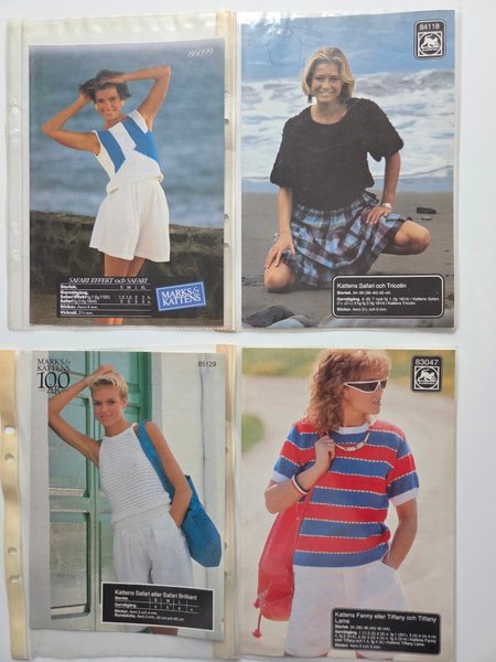 Fyra stickmönster från Marks & Kattens. Innehåller mönster för: Safari Effekt och Safari (86099), Kattens Safari och Tricolin (84118), Kattens Safari eller Safari Brilliant (85129), Kattens Fanny eller Tiffany och Tiffany Lame (83047).