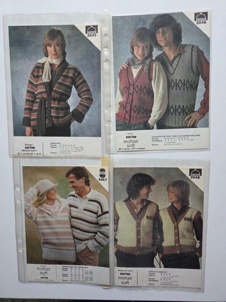 Samling av stickmönster från Variata. Innehåller mönster för damjacka (2045), slipover och väst i dam- och herrstorlekar (2046), randig dam- och herrtröja (2057) samt herr och damväst (2048).