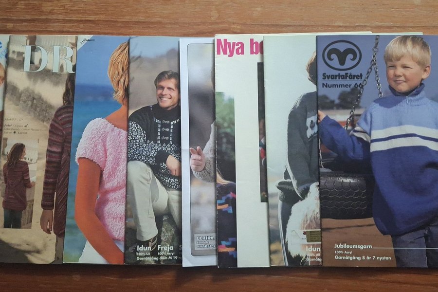 6 st med stickmönsterhäften från olika märken. Innehåller mönster från Skotte, DR, Idun/Freja, Nya modeller och Svarta Fåret. Mönstren är för olika plagg och garnkvaliteter, inklusive ull och akryl