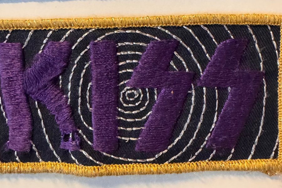 Broderad patch med KISS-logotypen i lila färg mot en svart bakgrund med vita spiraler. Patchen har en guldfärgad kant.