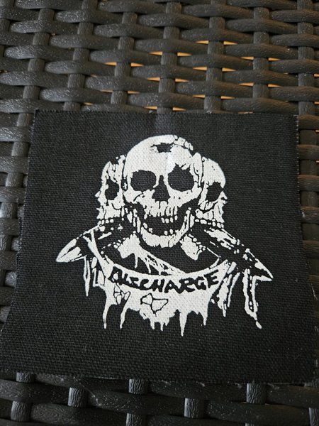 Svart tygmärke med Discharge motiv. Perfekt för att sy fast på jackan eller väskan.ca 12x12cm