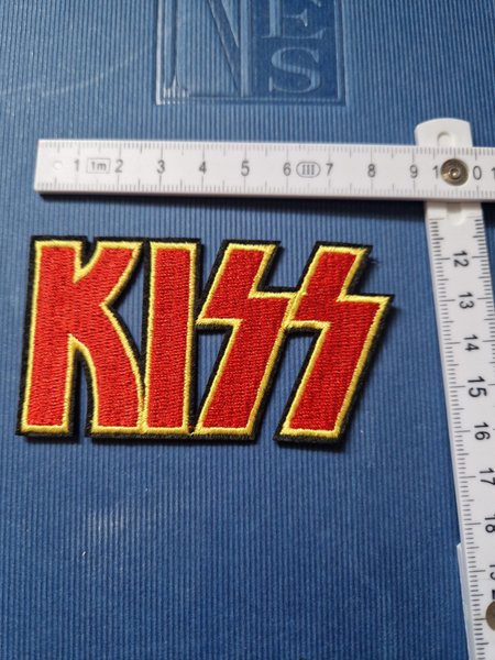 Broderat märke med KISS-logotypen i rött med guldkant och svart bakgrund. Perfekt för att anpassa kläder, väskor eller andra textilier.