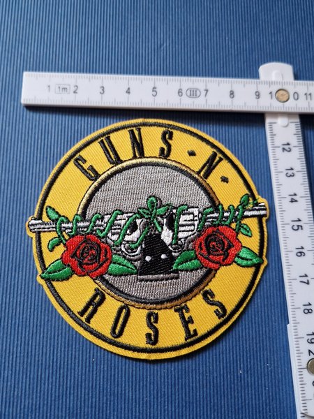 Guns N' Roses tygmärke med broderad design. Märket har en gul bakgrund med texten "Guns N' Roses" i svart. I mitten finns en grå cirkel med en revolver och rosor.