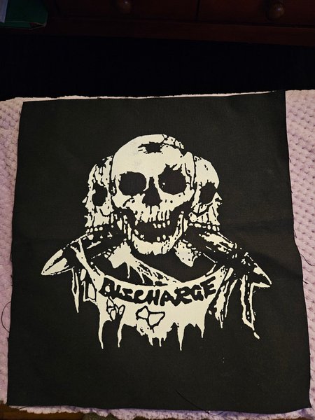 Svart tygmärke med Discharge motiv. Perfekt för att sy fast på jackan eller väskan för att visa din musiksmak.