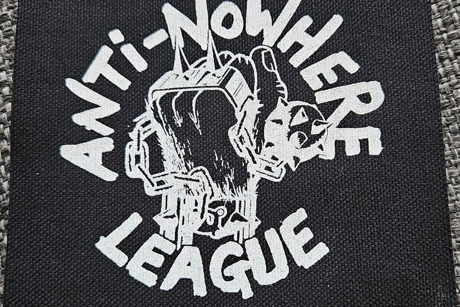 Svart tygmärke med Anti-Nowhere League tryckt i vitt. Motivet är en knuten näve med kedjor och taggar.