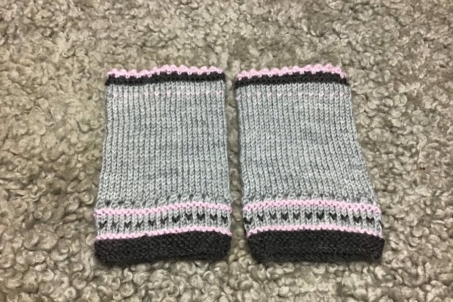 Ett par handstickade handledsvärmare i grått med detaljer i rosa och mörkgrått.Stickade i baby merino ull.