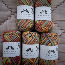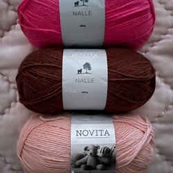 Fem nystan sockgarn om 50 gram (205 meter) styck. Två är oöppnade och tre är öppnade och delvis repade. Två är enfärgade och tre i print. Rekommenderade stickor och virknål är 3 mm. 24 m och 32 v = 10*10 cm.