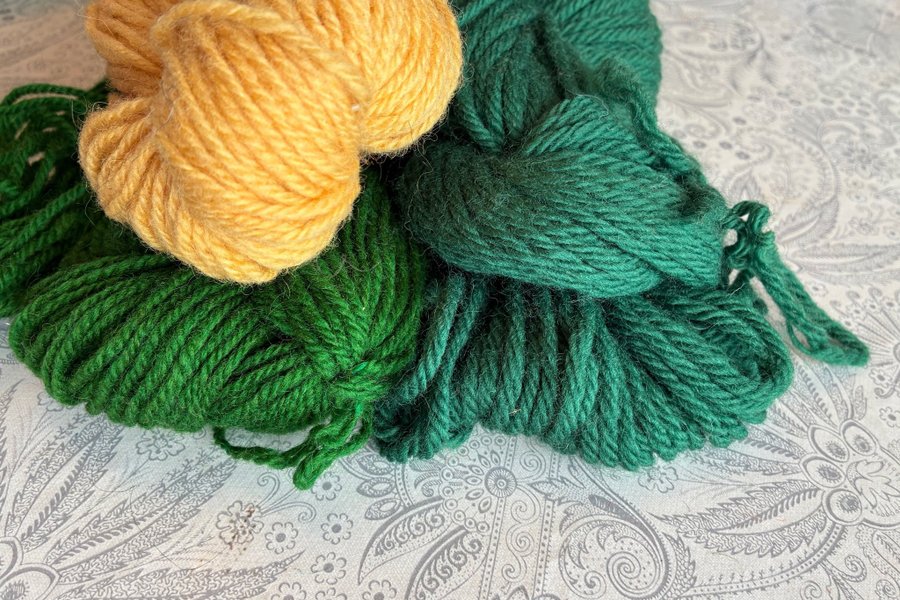 Här har vi 175 gram ullgarn. Den gula härvan och en grön är det trådigt garn i. Den andra gröna innehåller 4-trådigt garn. Samfrakt.