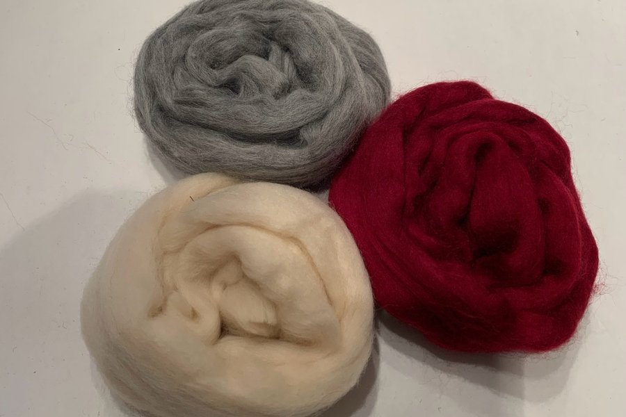 Ospunnen Merinoull (Tops) för filtning (tovning) tre färger, Grå, Rubinröd, Offwhite á 20g per färg, totalt 60 g
