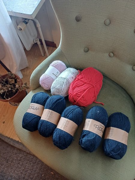 Fint ullgarn. Övre raden: minialpacka,lettloppi," doubleknitting". Undre raden : Merinoull. I verkligheten mer mariblå.