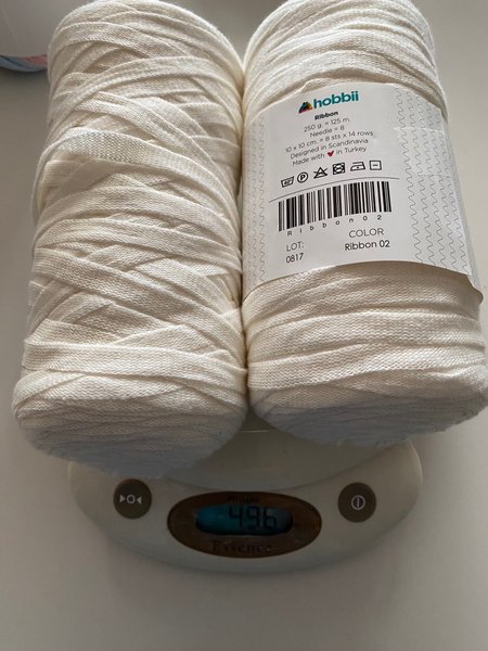 Två nystan vitt Ribbongarn (bomull) från Hobbii färg 02
