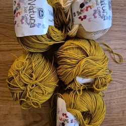 200 gr Fiesta vitt, 70 gr Fiesta beige, 43 gr grön/turkos, 45 gr rosa, 43 gr ljusgrön. Grövre garn så st 5 eller virknål 3,5-4.