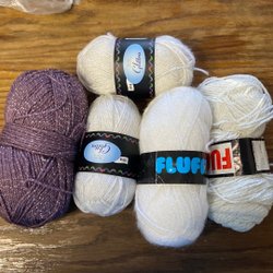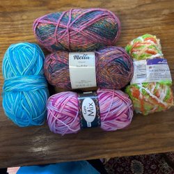 Olika garnnystan. Fulla nystan. 5 nystan av samma sort och fulla nystan. Ca 1.1 kg