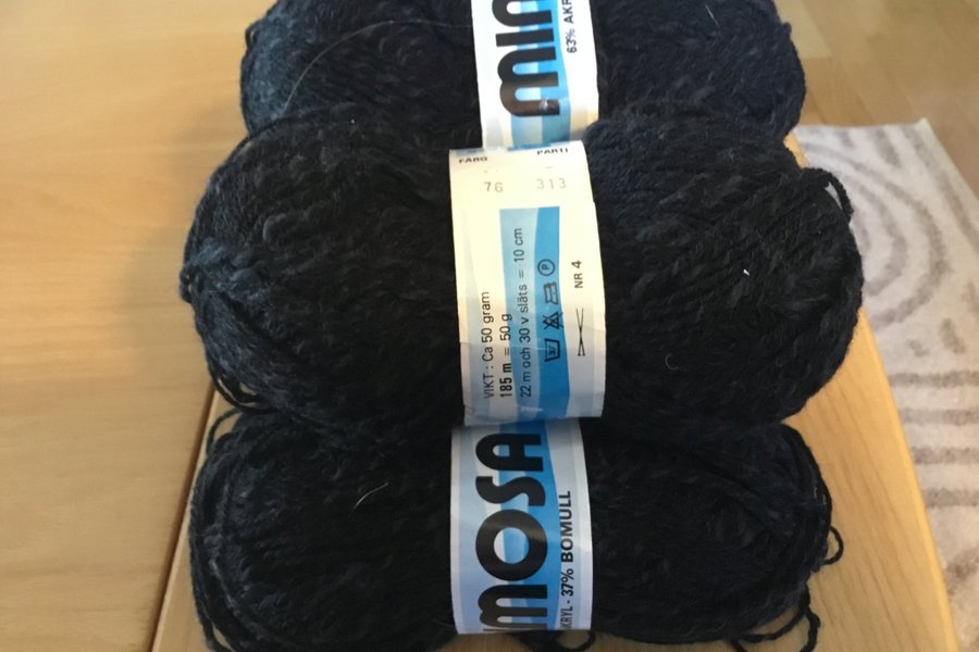 250 gr 5 st nystan men ett med lite upprepat garn. Färg svart. Mycket behagligt garn att sticka med. 63% akryl och 37% bomull