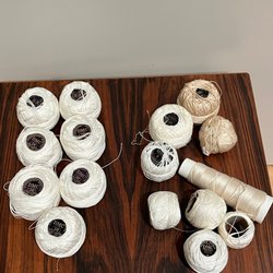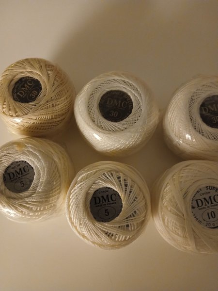 2 nystan nr 30 vitt, 1 nystan nr 30 beige, 1 nystan nr 10 vitt, 1 nystan nr 5 vitt, halvt nystan nr 5 vitt.