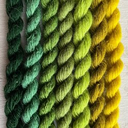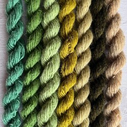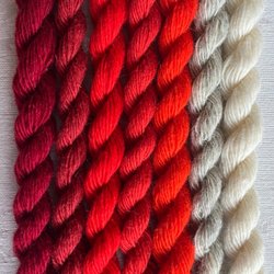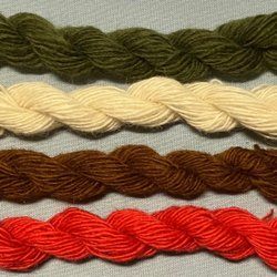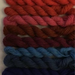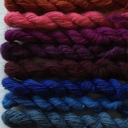 Enl bild. 100% ull. 4 olika färger. Varje docka innehåller ca 15 meter och är inte klippta i mindre längder. Nm 6/1 vilket betyder att det är tunt. Det går 600 meter på 100 gram. För vävning, broderi, virkning, stickning, amigurimi. Garnerna är av märkena Bergå och Fårö. Ytterligare något märke kan förekomma. Översta är Bergå färg 10. Nästnederst Bergå 1064. Jag har mer liknande garn ute på Tradera.