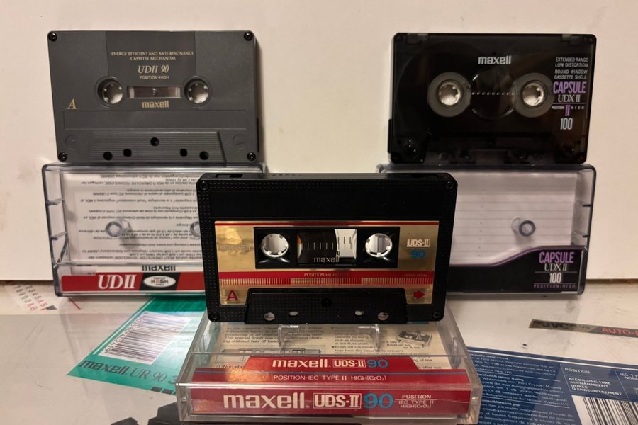 Parti med Maxell kassettband. Inkluderar modellerna UDS-II 90, UDII 90 och Capsule UDX II 100.
