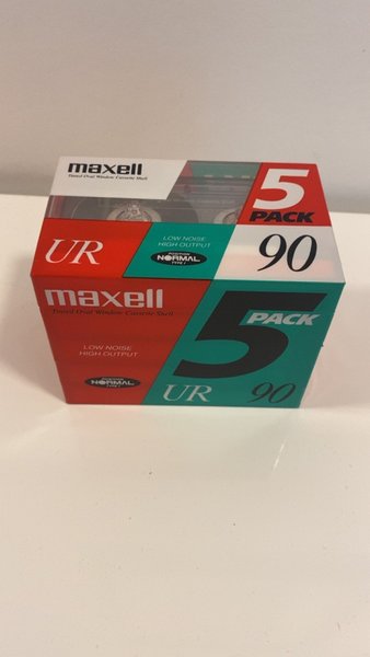 Oöppnad förpackning med 5 stycken Maxell UR 90 kassettband. Perfekt för inspelning av musik eller tal.